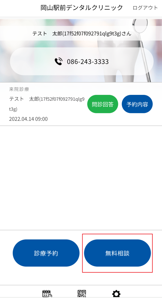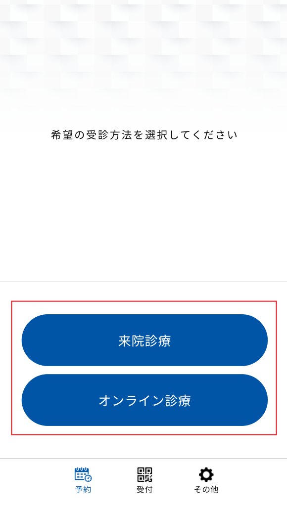 ②ログイン中の場合は、ホーム画面からの、各種予約(「診療予約」、「オンライン診療」、「来院診療」、「無料相談」)ボタンをタップして、確認ができます。