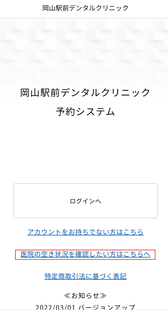 ①ログイン前ですと、初期画面で「医院の空き状況を確認したい方はこちらへ」をタップすると参照できます。