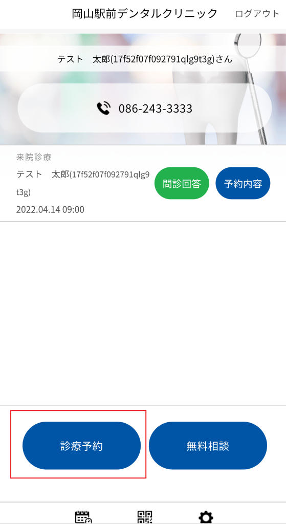 ホーム画面の「診療予約」又は「オンライン診療」ボタンをタップして、ご予約して下さい。