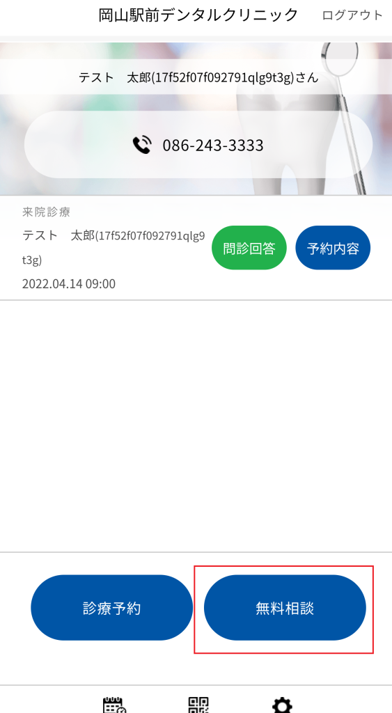 無料相談の新規予約の方法は? ホーム画面の「無料相談」ボタンをタップして、ご予約して下さい。 ただし、無料相談は医院によって、利用できない場合があり、その場合は、「無料相談」ボタンは表示されませんので、医院にお問い合わせ下さい。
